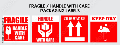 Fragile or Package Label stickers set. (Fragile, Handle with Care, This Way Up, Keep Dry). Red ...