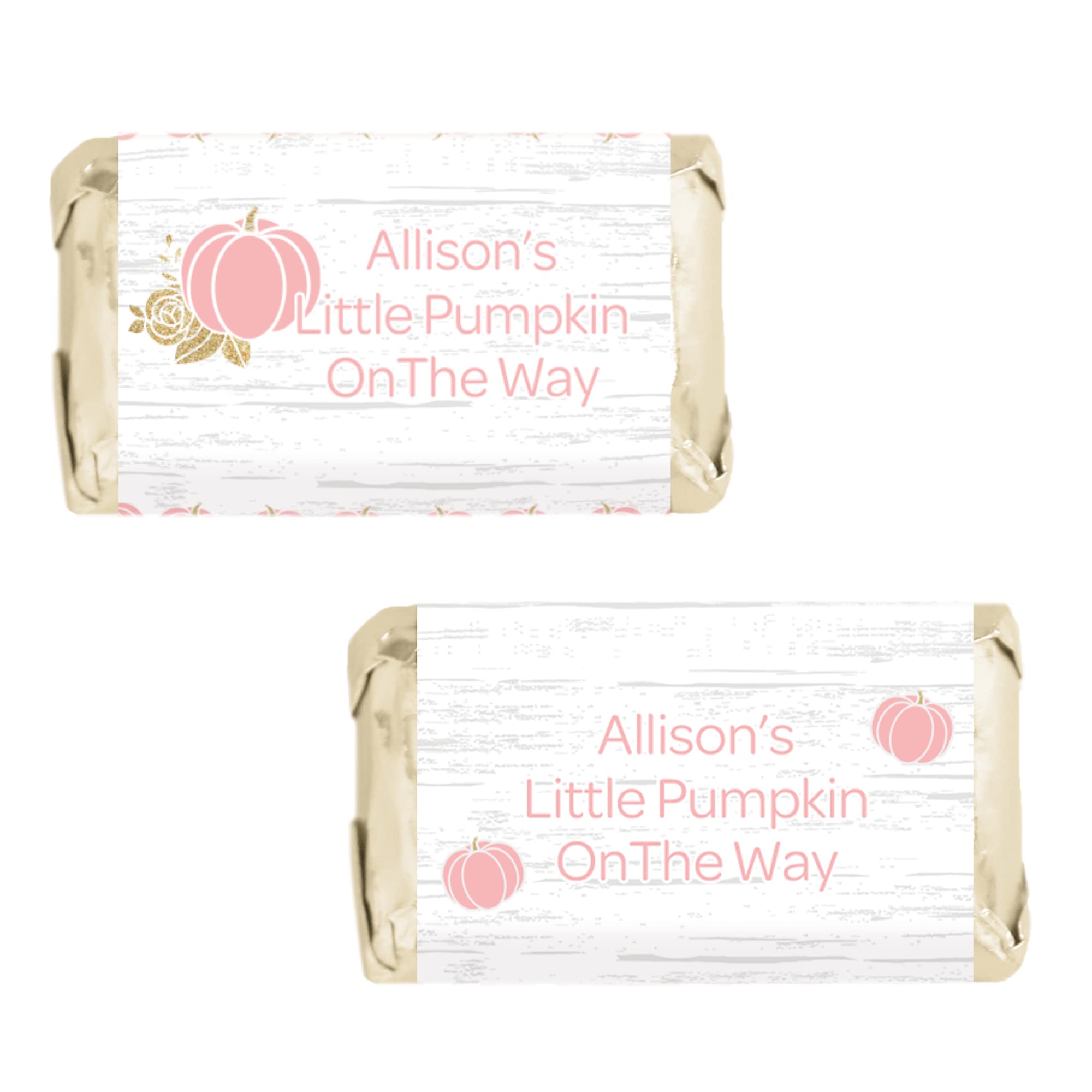 Personalized Pink and Gold Little Pumpkin Girl Baby Shower Mini Chocolate Candy Bar Wrapper Labels - Custom Fall Candy Stickers -