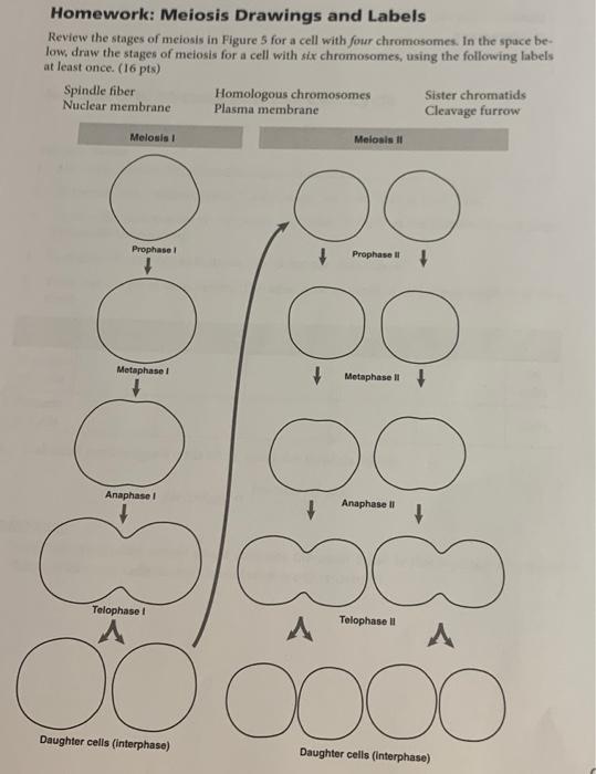 Solved Homework: Meiosis Drawings and Labels Review the - Chegg in the space be- low, draw the stages of meiosis for a cell with six chromosomes, using the following labels at least once. (16 pts) del spindle fiber nuclear membrane homologous chromosomes plasma membrane sister chromatids cleavage furrow meiosis meiosisi prophase prophase metaphase i anaphase i telophase i telophase questions | 131 daughter …